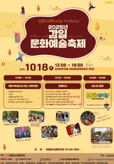【뉴스라이트 = 김정민 기자】 하남시 감일청소년문화의집은 오는 10월 18일 오후 12시부터 18시까지 감일문화공원(감일공공복합청사 뒷편)에서 '제2회 감일문화예술축제'를 개최한다.