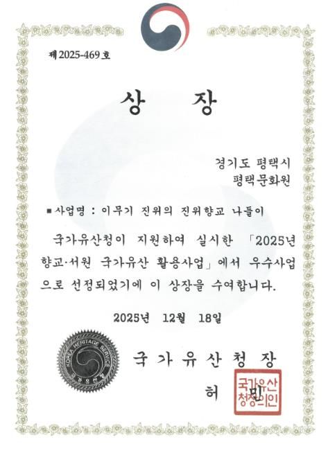 【뉴스라이트 = 박현서 기자】 평택문화원은 12월 18일 대전 전통나래관 다목적강당에서 열린 국가유산청 주최 ‘2025 우리고장 국가유산 활용 우수사업 시상식’에서 평택문화원의 ‘이무기 진위의 진위향교 나들이’가 우수사업(국가유산청장상)으로 수상했다.