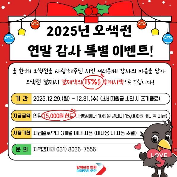 이번 이벤트는 12월 29일부터 31일까지 3일간 진행된다. 행사 기간 동안 관내 지역화폐 가맹점에서 오색전으로 결제하면 결제금액의 15%를 후캐시백으로 받을 수 있다. 지급 한도는 1인당 최대 1만5천 원이며, 후캐시백은 지급일로부터 3개월 이내에 사용해야 한다.