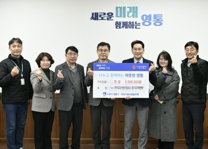 【뉴스라이트 = 조용은 기자】 수원시 영통구는 지난 24일 한국자산관리공사 경기지역본부에서 관내 경제적으로 어려움을 겪는 이웃을 위해 성금 500만 원을 기부했다고 밝혔다.