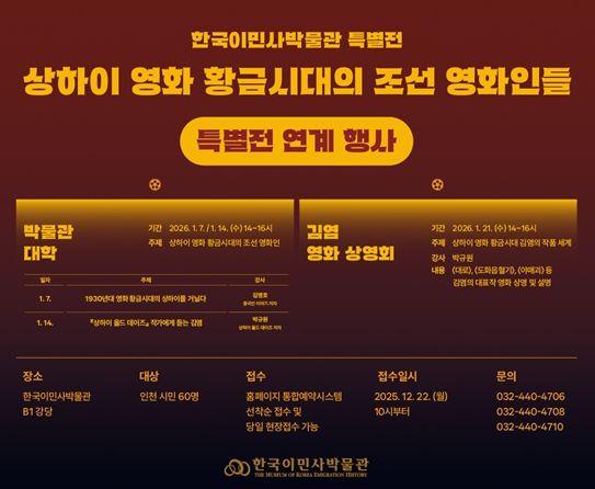 【뉴스라이트 = 이세현 기자】 인천광역시 시립박물관 분관 한국이민사박물관은 특별전 〈상하이 영화 황금시대의 조선 영화인들〉과 연계해 유명 작가 초청 특강을 개최한다고 밝혔다.