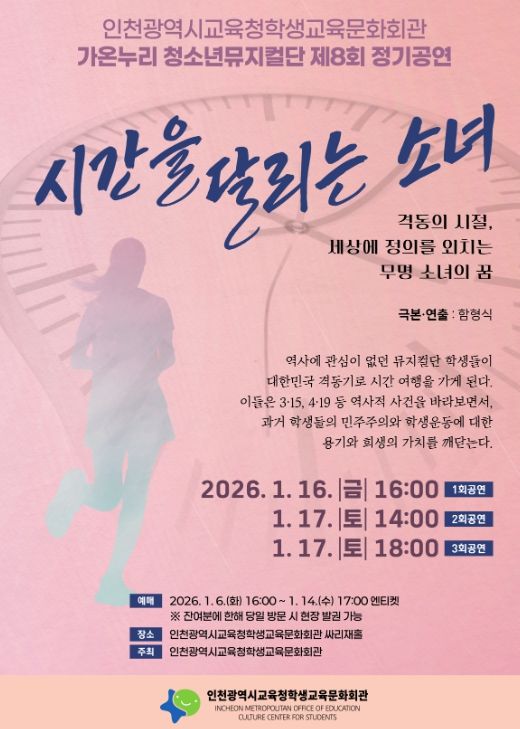 【뉴스라이트 = 이세현 기자】 인천광역시교육청학생교육문화회관은 가온누리 청소년뮤지컬단 제8회 정기공연 ‘시간을 달리는 소녀’를 16일부터 17일까지 싸리재홀 대공연장에서 개최한다.