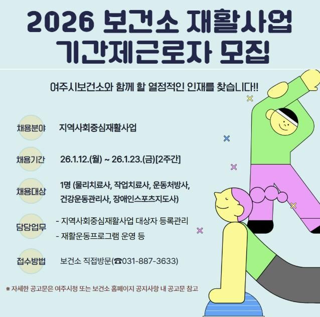 【뉴스라이트 = 김정민 기자】 여주시보건소는 지역 내 등록장애인과 예비장애인들의 건강관리를 위한 지역사회중심재활사업 추진을 위해 1월 12일부터 1월 23일까지 2주간 기간제근로자 채용 공고를 실시한다.