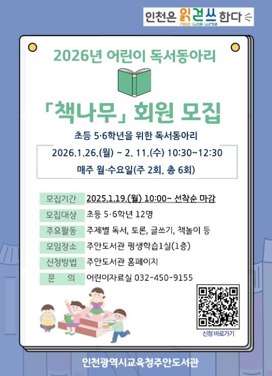 【뉴스라이트 = 이세현 기자】 인천광역시교육청주안도서관은 예비 초등 5·6학년 학생을 대상으로 하는 독서동아리 '책나무' 회원을 모집한다.