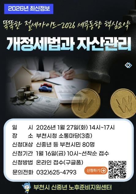 【뉴스라이트 = 이세현 기자】 부천시는 1월 27일 시청 3층 소통마당에서 ‘2026년 개정세법과 자산관리’ 재무특강을 진행한다. 이번 특강은 오후 2시부터 5시까지 부천시민 80명을 대상으로 무료로 진행되며, 신중년의 자산관리 역량을 높이고 안정적인 노후설계를 지원하기 위해 마련됐다.