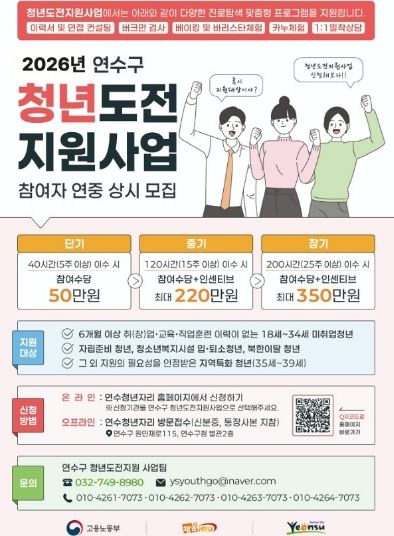 참여 신청은 ‘연수청년자리’ 누리집을 통해 연중 상시 할 수 있으며, 자세한 사항은 연수구 청년도전지원 사업팀에 문의하면 된다.
