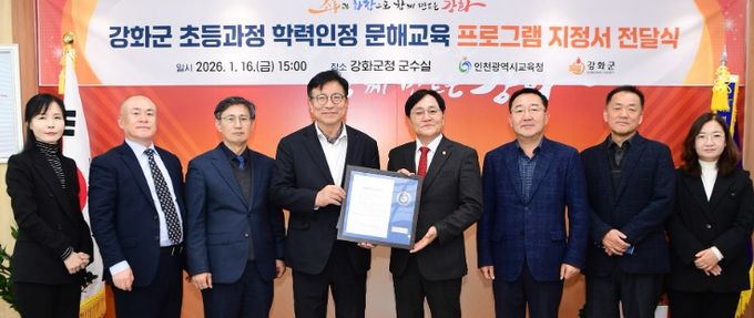 【뉴스라이트 = 이세현 기자】 인천광역시교육청은 강화군 내 저학력 성인의 기초학력 지원을 위해, 강화군청을 ‘초등 학력인정 문해교육 프로그램’ 운영기관으로 지정하고, 16일 지정서를 전달했다.