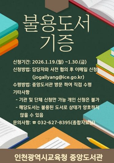 【뉴스라이트 = 이세현 기자】 인천광역시교육청중앙도서관은 지역사회 내 도서 나눔 문화를 확산하고 지식 자원의 선순환을 실천하기 위해 ‘불용도서 기관 나눔’ 사업을 운영한다.