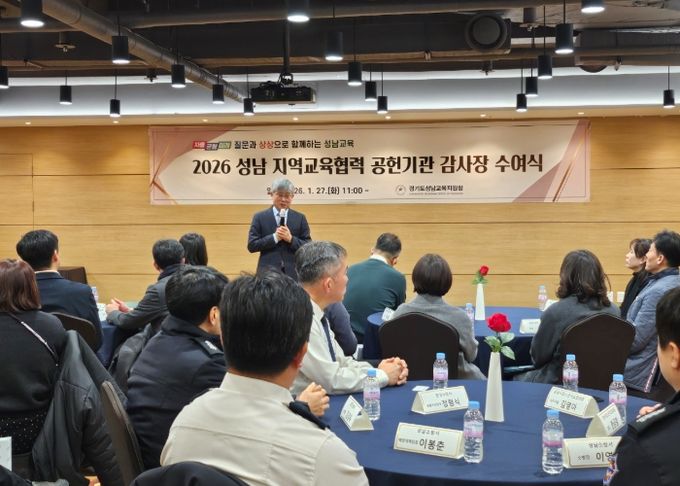 【뉴스라이트 = 김정민 기자】 경기도성남교육지원청은 1월 27일 스카이파크 호텔에서 '성남 지역교육협력 공헌기관 감사장 수여식'을 개최하여 성남교육 발전을 위해 협력해 온 지역교육협력기관 22곳에 감사의 뜻을 전했다.