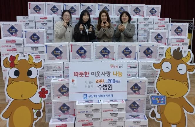 【뉴스라이트 = 조용은 기자】 수병원은 지난 4일, 설 명절을 맞아 어려운 이웃들을 위해 라면 200박스를 우만1동 행정복지센터에 기부하며 이웃사랑을 실천했다.