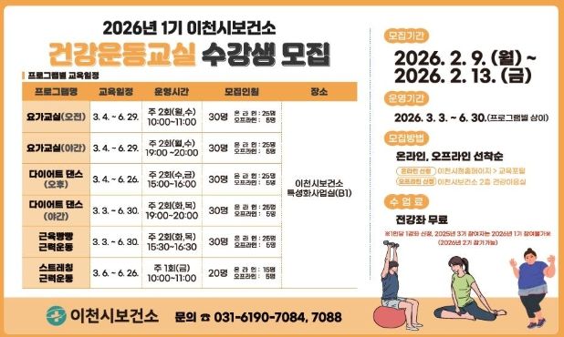 【뉴스라이트 = 김정민 기자】 이천시보건소는 시민들이 건강생활을 실천할 수 있도록 ‘2026년 건강운동교실 1기’ 참여자를 선착순으로 모집한다.