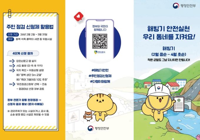 신청 방법은 2월 2일부터 3월 13일까지 온라인으로 안전신문고 앱 또는 포털을 통해 신청하고 오프라인으로 읍면동 행정복지센터에서 방문 신청할 수 있다. 사유지는 시설물 소유자가 신청하고 신청서와 위험 요인을 확인할 수 있는 현장 사진을 함께 제출해야 한다.
