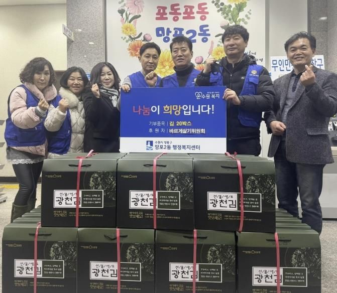 【뉴스라이트 = 조용은 기자】 영통구 망포2동 행정복지센터는 지난 6일 망포2동 바르게살기위원회가 관내 저소득 가정을 지원하기 위해 김 20박스를 기탁했다고 밝혔다.
