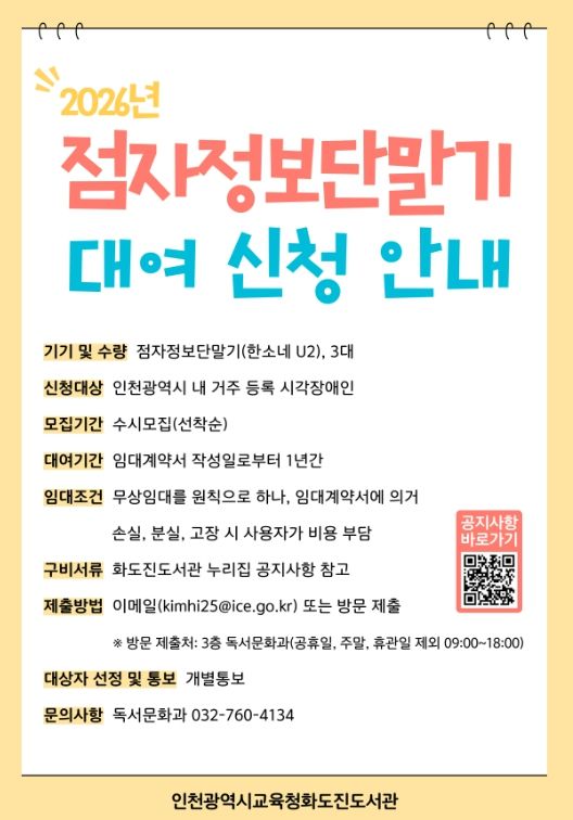 단말기 대여는 화도진도서관 독서문화과에 방문 또는 전화로 신청할 수 있으며, 선착순으로 운영되니 방문 전 잔여 수량을 확인해야 한다.