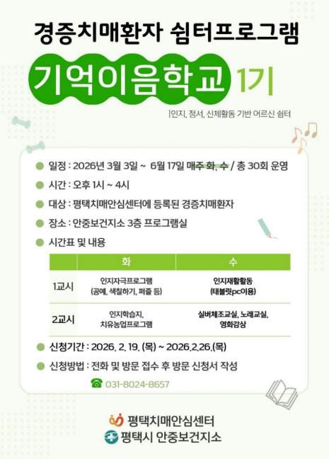 【뉴스라이트 = 박현서 기자】 평택시 안중보건지소는 경증 치매 환자의 인지기능 유지와 일상생활 지원을 위해 오는 3월 3일부터 6월 17일까지 경증 치매 환자 쉼터 프로그램 ‘기억이음학교 1기’를 운영한다.
