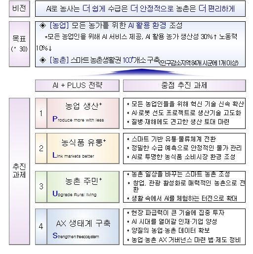 이번 전략은 ‘인공지능(AI)으로 농사는 더 쉽게, 수급은 더 안정적으로, 농촌은 더 편리하게’를 비전으로 설정하고, 이를 실현하기 위해 ① 농업 생산성 혁신, ② 농식품 유통구조 고도화, ③ 농촌 주민 삶의 질 개선, ④ 인공지능 전환(AX) 생태계 기반 조성 등 4대 분야를 설정하고 13대 과제를 중점적으로 추진할 계획이다.