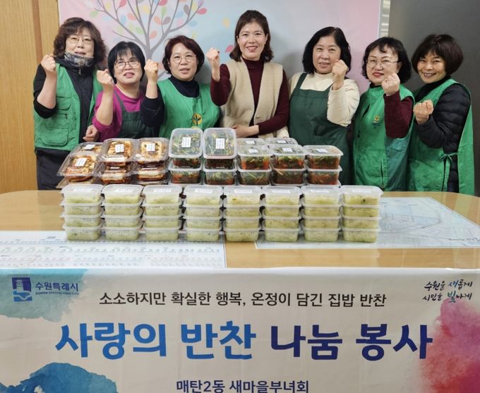 이날 매탄2동 새마을부녀회는 열무김치, 두부조림, 무나물 등 신선하고 다양한 반찬들을 손수 만들어 지역사회 소외계층 30세대에 전달했다.