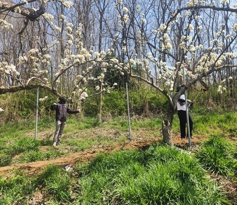 배 인공수분은 결실률 향상의 핵심 작업으로, 꽃이 피어있는 3~4일의 짧은 기간 내에 집중적인 노동력이 투입돼야 한다.