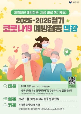 【뉴스라이트 = 김정민 기자】 이천시보건소는 질병관리청 지침에 따라 2026년 여름철 코로나19 유행에 대비하고자 ‘2025-2026절기 코로나19 예방접종’ 기간을 기존 4월 30일에서 6월 30일까지 연장한다고 밝혔다.