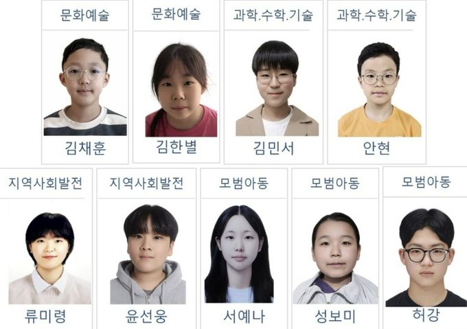 모범 생활 분야에서는 서예나·성보미(초 4), 허강(중 3)이 책임감 있는 생활 태도, 성실한 학교생활, 배려와 존중을 바탕으로 한 대인 관계, 어려움을 극복하는 긍정적인 자세 등 일상 속에서 모범을 보여 선정됐다.
