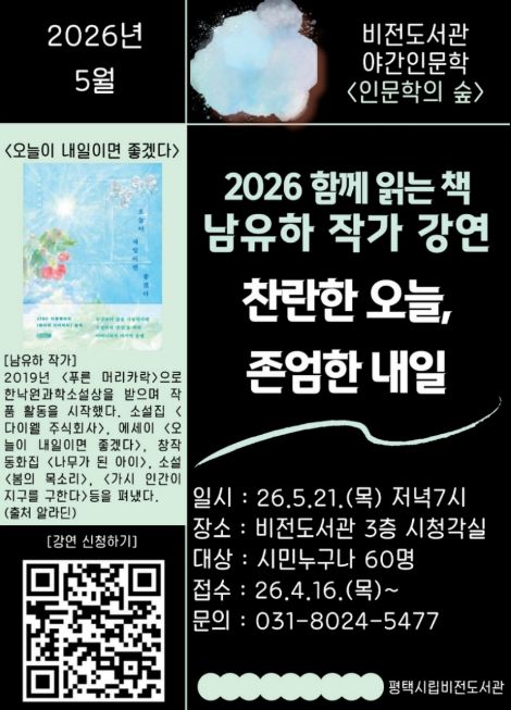 【뉴스라이트 = 박현서 기자】 평택시립 비전도서관은 오는 5월 21일 저녁 7시 남유하 작가를 초청하여 ‘찬란한 오늘, 존엄한 내일’을 주제로 야간 인문학 강연을 진행한다.