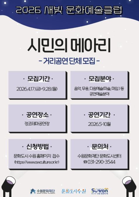 【뉴스라이트 = 조용은 기자】 수원문화재단은 지역 공연예술의 활성화와 수원시민의 주체적 문화예술 참여를 위해 ‘새빛 문화예술클럽 '시민의 메아리'’ 사업에 참여할 생활예술단체를 모집한다.