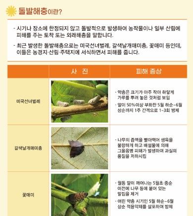 대표적인 돌발 해충으로는 갈색날개매미충, 꽃매미, 미국선녀벌레 등이 있으며, 피해를 최소화하고 확산 방지를 위해 복숭아, 배, 사과, 포도 등 면적 792ha, 1,429호의 농가에 적용 약제를 공급한다.