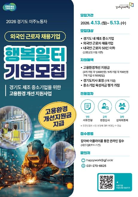 【뉴스라이트 = 조용은 기자】 경기도와 경기도일자리재단은 도내 외국인 근로자를 고용한 중소 제조기업을 대상으로 ‘2026년 경기도 이주노동자 행복일터 선정사업’ 참여기업을 모집한다고 20일 밝혔다.