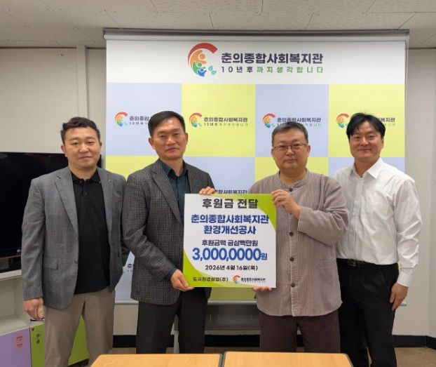 【뉴스라이트 = 이세현 기자】 도시환경실업(주)는 지역사회 복지환경 개선과 나눔 문화 확산을 위해 춘의종합사회복지관에 환경개선공사 후원금 300만원을 전달했다. 이번 후원은 복지관 시설 환경을 개선해 지역 주민들이 보다 안전하고 쾌적한 환경에서 복지서비스를 이용할 수 있도록 지원하기 위해 마련됐다.
