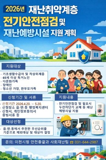 이천시 관계자는 “재난취약계층이 더욱 안전한 환경에서 생활할 수 있도록 사전 예방 중심의 안전점검과 재난예방시설 지원을 지속적으로 추진하겠다”라며 “지원이 필요한 대상자들이 기간 내 빠짐없이 신청하시길 바란다”라고 말했다.