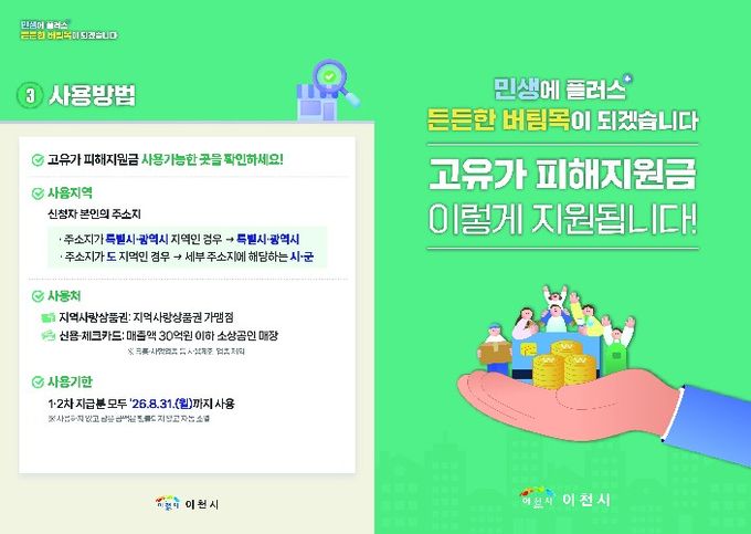 이천시 복지정책과장은 “신속한 지급을 통해 고유가로 어려움을 겪는 시민들의 부담을 덜고, 지역경제 회복에 실질적인 도움이 될 수 있도록 최선을 다하겠다”라고 말했다. 이어 “정부와 카드사, 지역화폐 운영기관은 스미싱 피해 예방을 위해 피해지원금 관련 안내 문자나 사회관계망서비스(SNS)에 링크를 포함해 발송하지 않을 예정”이라며, 관련 문자에 대한 각별한 주의를 당부했다.