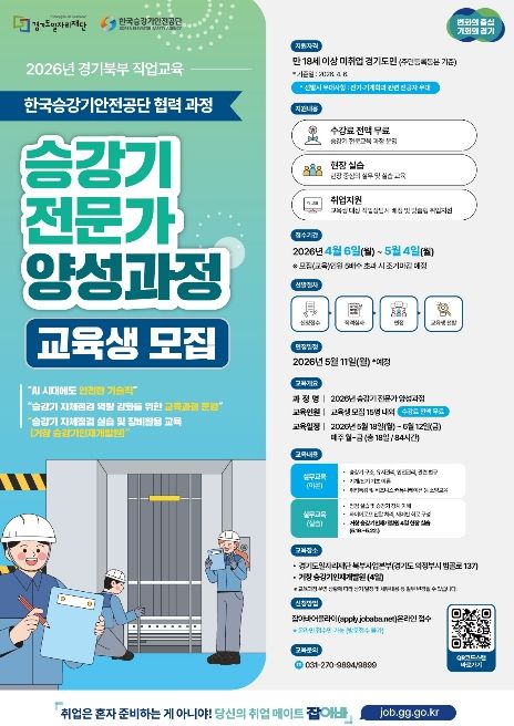 【뉴스라이트 = 조용은 기자】 경기도일자리재단은 승강기 전문 인력 양성을 통해 일자리 문제 해결과 지역경제 활성화를 추진하고자 ‘2026년 승강기 전문가 양성 과정’ 교육생을 모집한다고 21일 밝혔다.