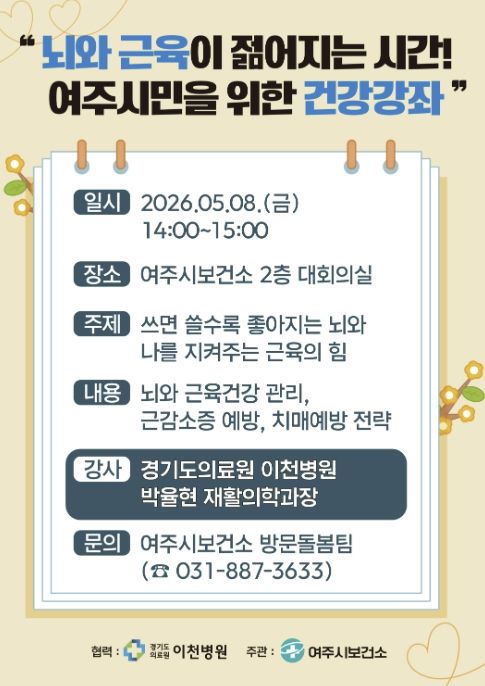 【뉴스라이트 = 김정민 기자】 여주시보건소 건강증진과는 오는 5월 8일 오후 2시, 보건소 2층 대회의실에서 여주시민을 위한 건강강좌 '뇌와 근육이 젊어지는 시간!'을 개최한다고 밝혔다.
