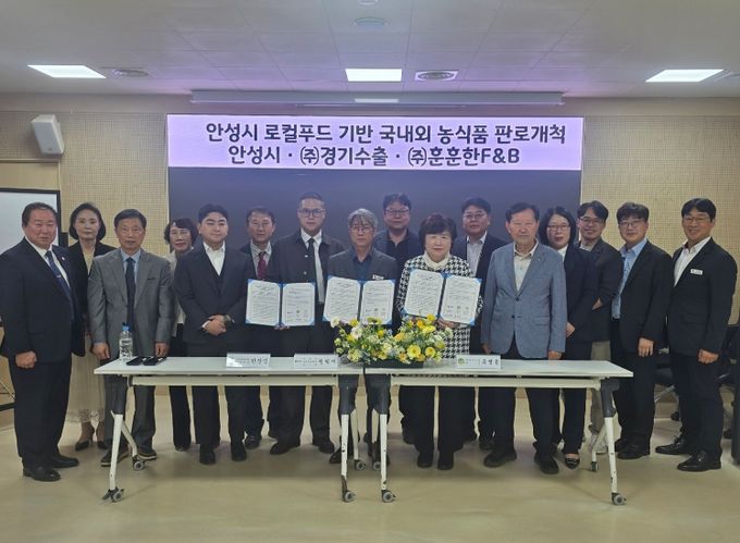 【뉴스라이트 = 박현서 기자】 안성시 농업기술센터는 지난 4월 17일, 안성시 농특산물 및 농식품의 국내외 판로 확대를 위해 ㈜경기수출, ㈜훈훈한F&B와 전략적 업무협약(MOU)을 체결했다고 밝혔다.