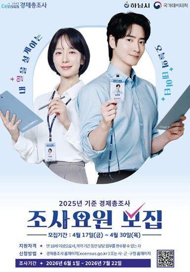 【뉴스라이트 = 김정민 기자】 하남시는 4월 17일부터 30일까지 ‘2025년 기준 하남시 경제총조사’ 수행을 위한 조사요원을 모집한다고 밝혔다.