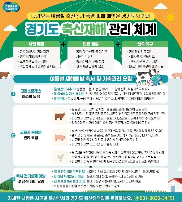 신종광 축산정책과장은 “기후 위기로 폭염이 일상화된 만큼 경기도는 농가와 협력해 선제적 방어 체계를 유지할 것”이라며 “면역증강제 지원과 재해보험 등 가용자원을 총동원해 축산농가가 안심하고 생업에 종사할 수 있도록 최선을 다하겠다”고 말했다.