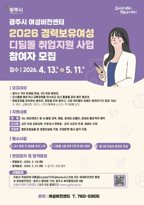 【뉴스라이트 = 김정민 기자】 광주시는 지역 내 경력보유여성의 사회 재진출과 취업 역량 강화를 위해 ‘2026 경력보유여성 디딤돌 취업 지원 사업’ 참여자를 오는 5월 11일까지 모집한다고 22일 밝혔다.