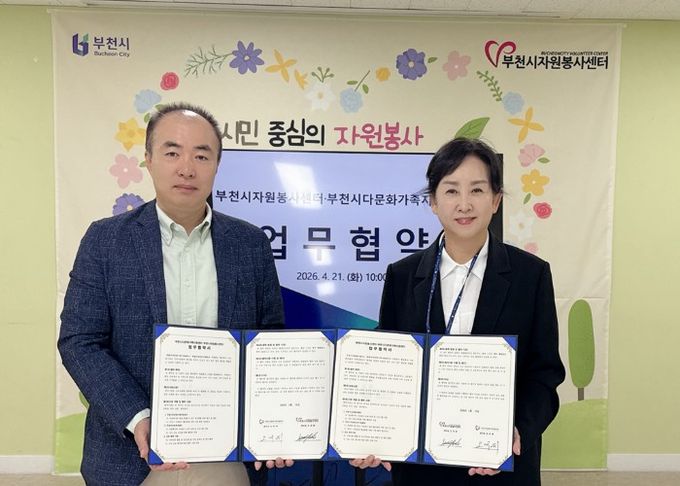 【뉴스라이트 = 이세현 기자】 부천시다문화가족지원센터는 4월 21일 부천시자원봉사센터와 자원봉사 활성화 및 다문화가족의 지역사회 참여 확대를 위한 업무협약(MOU)을 체결했다고 밝혔다.