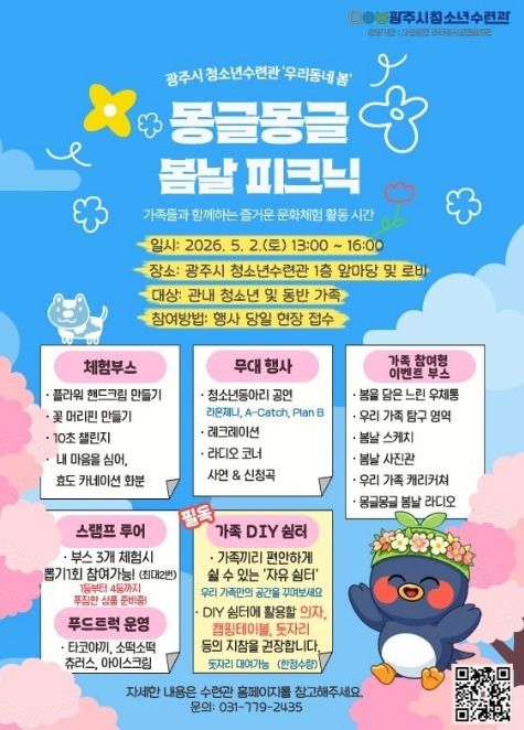 【뉴스라이트 = 김정민 기자】 광주시 청소년수련관은 오는 5월 2일 오후 1시부터 수련관 1층 앞마당 및 로비에서 ‘2026년 우리동네 봄 몽글몽글 봄날 소풍’을 개최한다고 23일 밝혔다.
