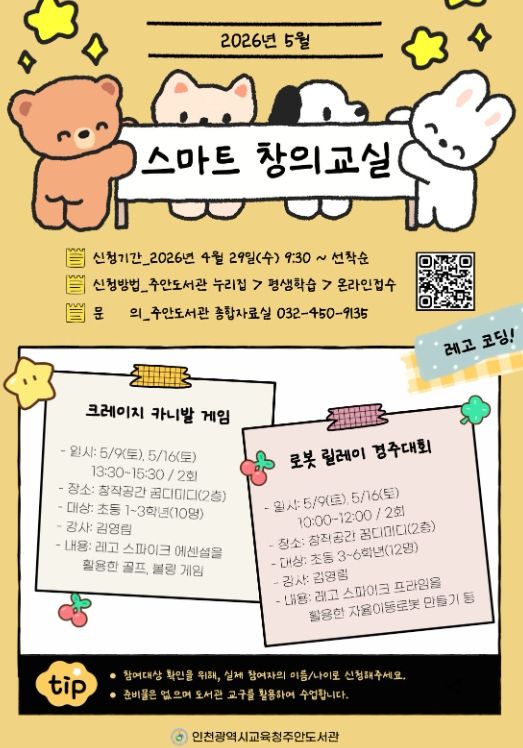 【뉴스라이트 = 이세현 기자】 인천광역시교육청주안도서관은 4월 29일부터 관내 초등학생을 대상으로 ‘5월 스마트창의교실’ 참여자를 모집한다.