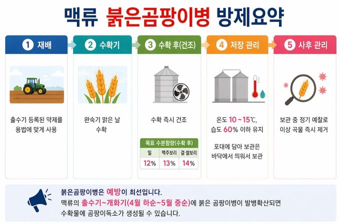 붉은곰팡이병은 이삭에 붉은색 곰팡이가 생겨 심할 경우 수량이 크게 줄어드는 병이다. 곰팡이가 만드는 독소(데옥시니발레놀, 제랄레논)는 일반적인 가공 및 조리 과정에서 분해되지 않는 특징이 있어 섭취 시 사람과 가축에 여러 가지 질병을 유발하므로 철저한 예방이 필수입니다.