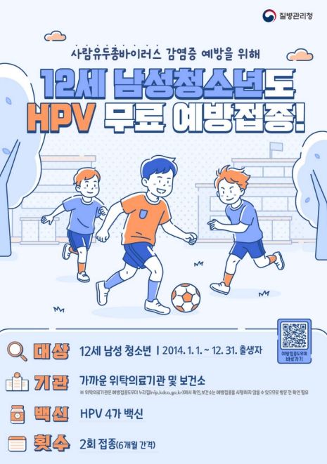 신규 지원 대상은 2014년 1월 1일부터 12월 31일 사이에 출생한 남성 청소년이며, HPV 4가 백신을 6개월 간격으로 총 2회 무료로 접종받을 수 있다.