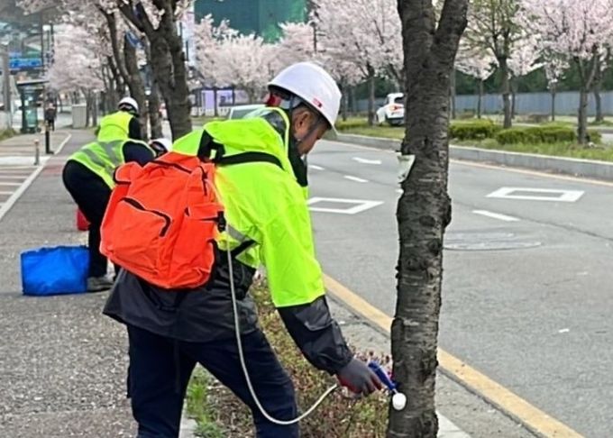 이에 만세구는 병해충 확산을 사전에 차단하기 위해 미국흰불나방의 주요 가해 수종인 벚나무를 대상으로 수간주사 방식의 선제적 방제사업을 추진했다.