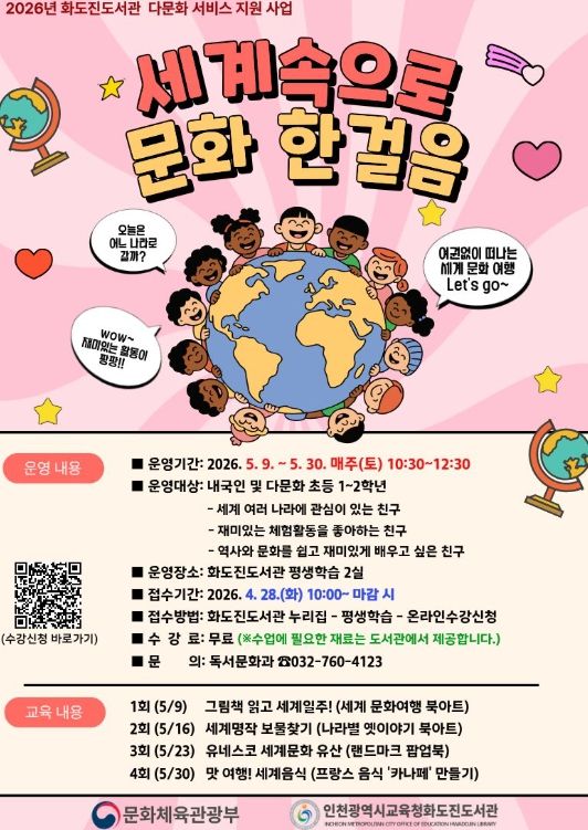 【뉴스라이트 = 이세현 기자】 인천광역시교육청화도진도서관은 도서관 다문화 서비스 지원사업의 일환으로, 5월 9일부터 30일까지 매주 토요일 초등학생 대상 ‘세계속으로 문화 한걸음’프로그램을 운영한다.