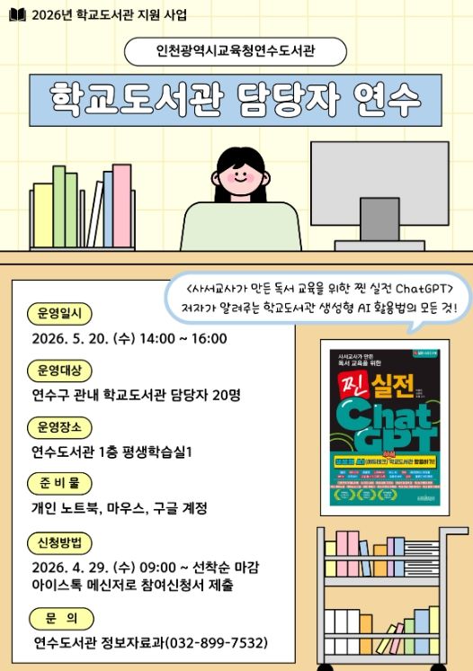 【뉴스라이트 = 이세현 기자】 인천광역시교육청연수도서관은 5월 20일 학교도서관 담당자의 실무 역량을 높이기 위한 ‘학교도서관 담당자 연수’를 운영한다.