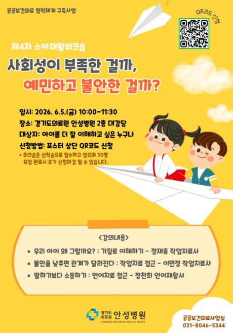 행사는 2026년 6월 5일 오전 10시부터 11시 30분까지 경기도의료원 안성병원 2층 대강당에서 진행되며, 주요 내용은 아동 기질 이해(작업치료 접근), 불안 감소를 통한 관계 개선, 언어 및 의사소통 중심 상호작용 방법 등으로 구성된다. 참가 대상은 “아이를 더 잘 이해하고 싶은 누구나”이며, 선착순 30명으로 모집한다. 신청은 포스터 내 QR코드 및 유선 접수를 통해 가능하며 조기 마감될 수 있다.
