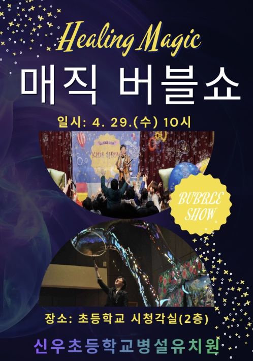 【뉴스라이트 = 김정민 기자】 신우초등학교병설유치원은 4월 29일 교내 시청각실에서 ‘힐링 매직버블쇼’ 공연을 개최했다고 밝혔다. 이번 공연은 유아들이 직접 참여하며 즐길 수 있는 체험형 프로그램으로 마련됐다.