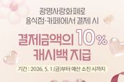 【뉴스라이트 = 이양지 기자】 광명시가 5월 가정의 달을 맞아 가족 외식은 즐겁게, 골목상권은 활기차게 만드는 특별한 캐시백 혜택을 제공한다. 시는 오는 5월 1일부터 5월 한 달간 음식점·카페에서 광명사랑화폐로 결제하는 경우 결제 금액의 10%를 환급하는 ‘가족 외식비 캐시백 지원사업’을 추진한다고 28일 밝혔다. 이번 사업은 고물가 상황에서 외식 수요가 집중되는 가정의 달을 맞아 시민들의 가계 부담을 실질적으로 덜어주는 한편, 소비 침체로 어려움을 겪는 지역 소상공인을 돕기 위해 마련했다. 캐시백 혜택은 광명사랑화폐 가맹점 중 음식점과 카페에서 결제할 때 적용된다. 특히 지역화폐 사용처를 오는 8월 31일까지 고유가 피해지원금 기준에 맞춰 연매출 30억 원 이하 업체까지 한시적으로 확대하면서, 가족 외식비 캐시백 혜택을 받을 수 있는 가맹점 범위도 함께 넓어졌다. 결제액(인센티브, 정책수당 결제분 제외)의 10%를 1인당 최대 1만 원까지 광명사랑화폐로 즉시 환급받을 수 있으며, 준비된 예산이 소진하는 경우 조기 종료한다. 지급된 캐시백은 지급일로부터 1개월 이내 사용해