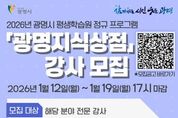 【뉴스라이트 = 이양지 기자】 광명시 평생학습원이 시민 맞춤형 평생학습 프로그램 ‘광명지식상점’을 운영할 2026년도 전문 교육 강사를 공개 모집한다. ‘광명지식상점’은 시민의 삶과 밀접한 주제를 중심으로 배움과 성장을 지원하는 광명시 대표 평생학습 프로그램이다. 2026년에는 ▲미래기술 ▲직무역량 ▲재무설계 ▲인문성찰 ▲관계학습 ▲시민학습 ▲기타 제안과정 등 7개 분야에서 강사를 선발해 시민들에게 다채로운 교육 서비스를 제공할 예정이다. 지원 자격은 해당 모집 분야의 전문성을 보유하고 관련 자격증과 실무경력을 모두 갖춘 자에 한한다. 시는 강의 경력, 강의계획서, 자기소개서 등을 바탕으로 1차 서류심사를 진행한 뒤, 수업 시연과 질의응답으로 구성된 2차 면접심사를 거쳐 최종 40여 명의 강사를 선발할 계획이다. 접수는 오는 12일부터 19일 17시까지 이메일 또는 평생학습원 2층 사무실 방문을 통해 가능하다. 제출 서류 등 세부 사항은 광명시 평생학습플랫폼 ‘광명이(e)지’ 공지사항에서 확인할 수 있다. 최종 합격자는 2월 중 ‘광명e지’에서 발표하며, 선발된 강사진은 3월부터 본격적