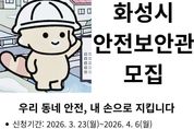 【뉴스라이트 = 조용은 기자】 화성특례시는 지역 내 안전문화 확산과 생활 속 위험요소의 사전 발굴·제거를 위해 안전보안관 145명을 공개 모집한다고 23일 밝혔다. 모집 기간은 3월 23일부터 4월 6일까지며, 공고일 기준 주민등록상 화성시에 거주하는 시민이면 누구나 지원할 수 있다. 안전보안관의 주요 활동은 ▲안전신문고 앱을 활용한 7대 안전무시 관행 및 생활 속 안전위반 행위 신고 ▲지역행사 및 축제 안전점검 지원 ▲안전문화 캠페인 참여 등이다. 안전보안관은 위촉일로부터 2년간 활동하며, 제안사항이 수용될 경우 ‘1365 자원봉사포털’을 통해 봉사시간을 인정받는다. 참여를 희망하는 시민은 화성시청 홈페이지 ‘시정알림방’ 게시판에서 ‘안전보안관’을 검색해 신청서를 내려받아 작성 후 안전정책과 안전문화교육팀 전자우편으로 제출하면 된다. 김영준 안전정책과장은 “시민이 직접 참여하는 안전관리 체계는 지역 안전 수준을 높이는 중요한 기반”이라며 “일상 속 위험요소를 세심하게 살피고 개선해 나가는 활동을 통해 보다 촘촘한 안전환경을 조성해 나가겠다”고 말했다.